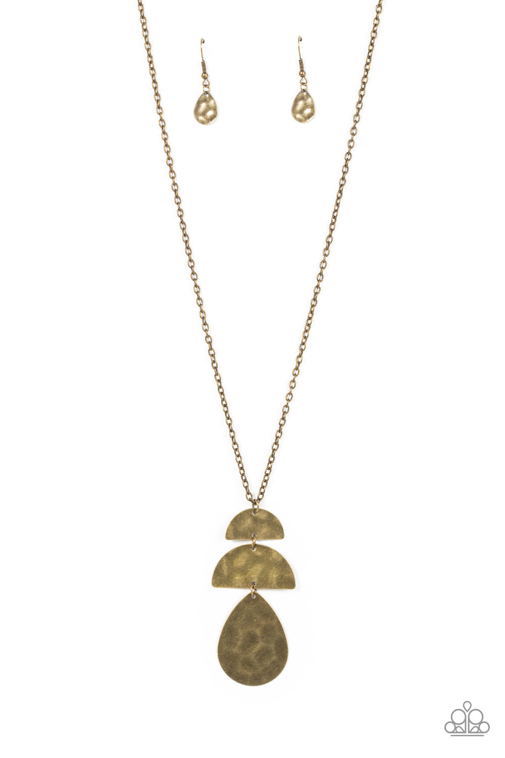 Brushed in a burnished shimmer, a hammered brass teardrop swings from the bottom of a pair of half moon brass frames that stack into a tribal inspired pendant at the bottom of a rustic brass chain. Features an adjustable clasp closure.