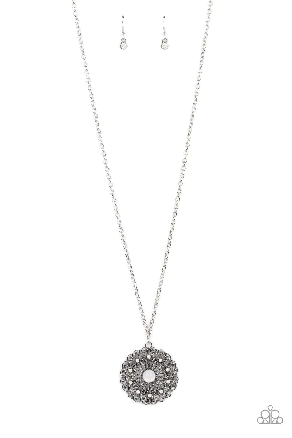 Dotted in dainty opalescent beads, stacks of whimsical silver petals bloom from an opal beaded center, creating a decorative floral pendant at the bottom of a lengthened silver chain. Features an adjustable clasp closure.