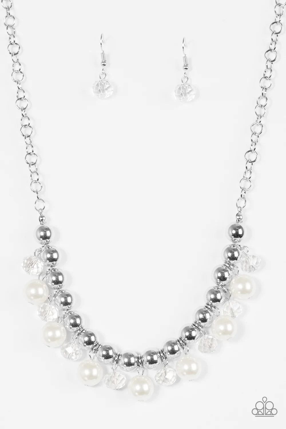 Infused with a bold silver chain, classic silver beads are threaded along a skinny wire below the collar. Pearly white and faceted crystal-like beads swing from the bottom of the silver beads, creating a refined fringe. Features an adjustable clasp closure.