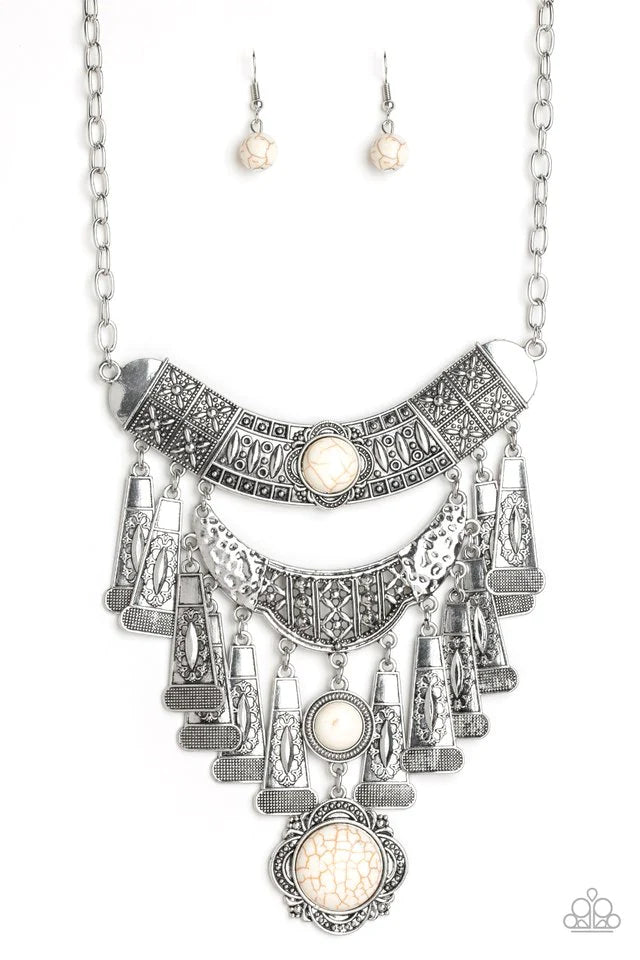 Infused with refreshing white stone accents and a collision of hammered, studded, and embossed patterns, two silver half-moon plates dramatically stack below the collar. Swirling with studded filigree detail, ornate silver frames swing from the bottoms of the stacked pendants, creating a fierce tribal inspired fringe. Features an adjustable clasp closure.