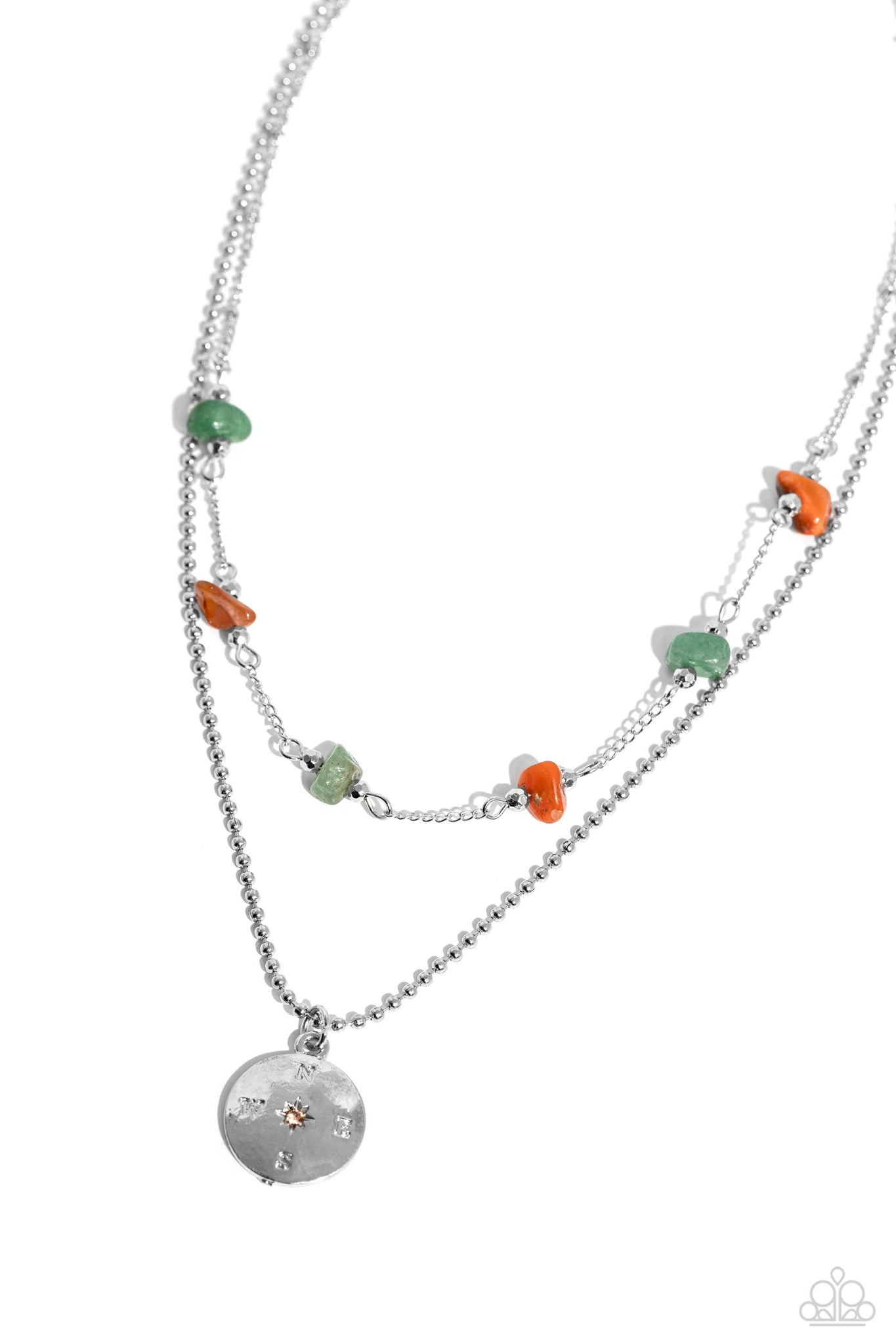 Threaded along a silver satellite chain, chiseled jade and orange stones fall along the collar in a grounded pattern. A delicate silver ball chain featuring a dangling silver pendant with compass details and a peachy center layers with the earthy stones for a wanderlust combo. Features an adjustable clasp closure. As the stone elements in this piece are natural, some color variation is normal.