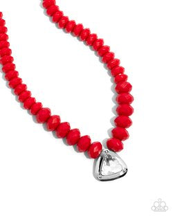 Faceted red beads are threaded along an invisible wire, creating a bold statement. A triangular white gem is set in a sleek silver frame at the center, adding a striking focal point to the design. Features an adjustable clasp closure.