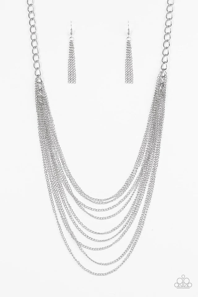 Shiny silver chains layer down the chest, creating an edgy tone on tone palette for a bold industrial look. Features an adjustable clasp closure. Sold as one individual necklace. Includes one pair of matching earrings.