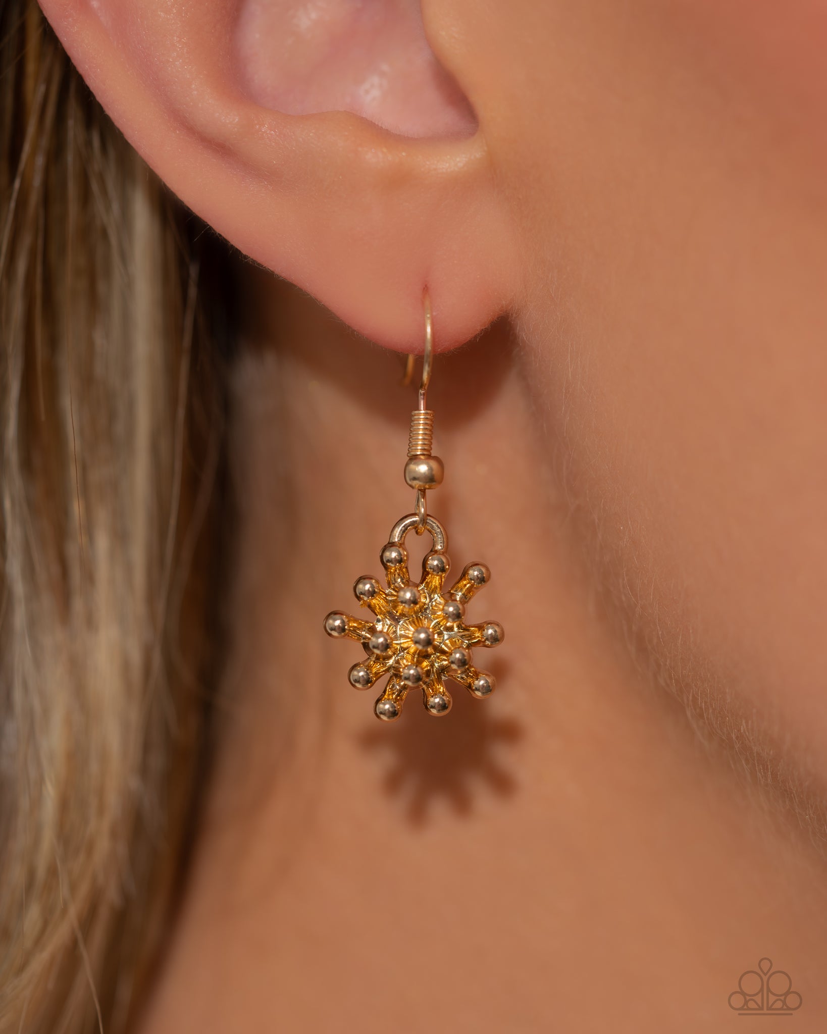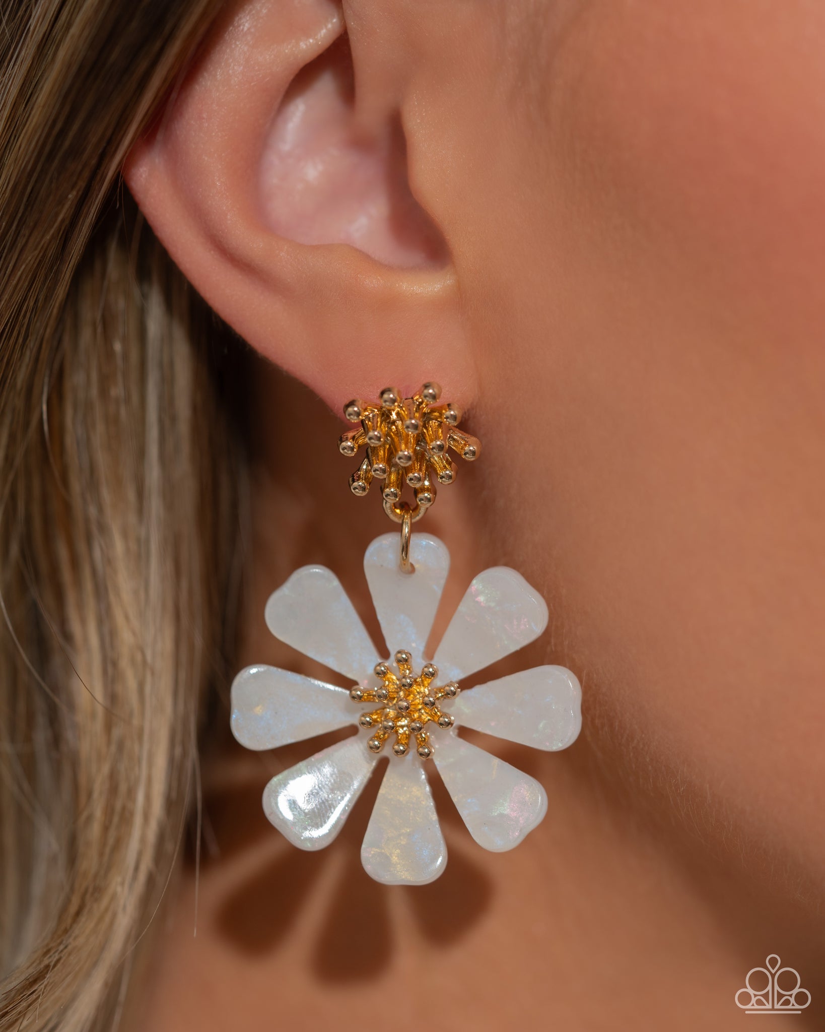 Featuring a soft, speckled pattern, a collection of white acrylic flowers bloom around tactile gold studded centers for a whimsical display around the neckline. Features an adjustable clasp closure.