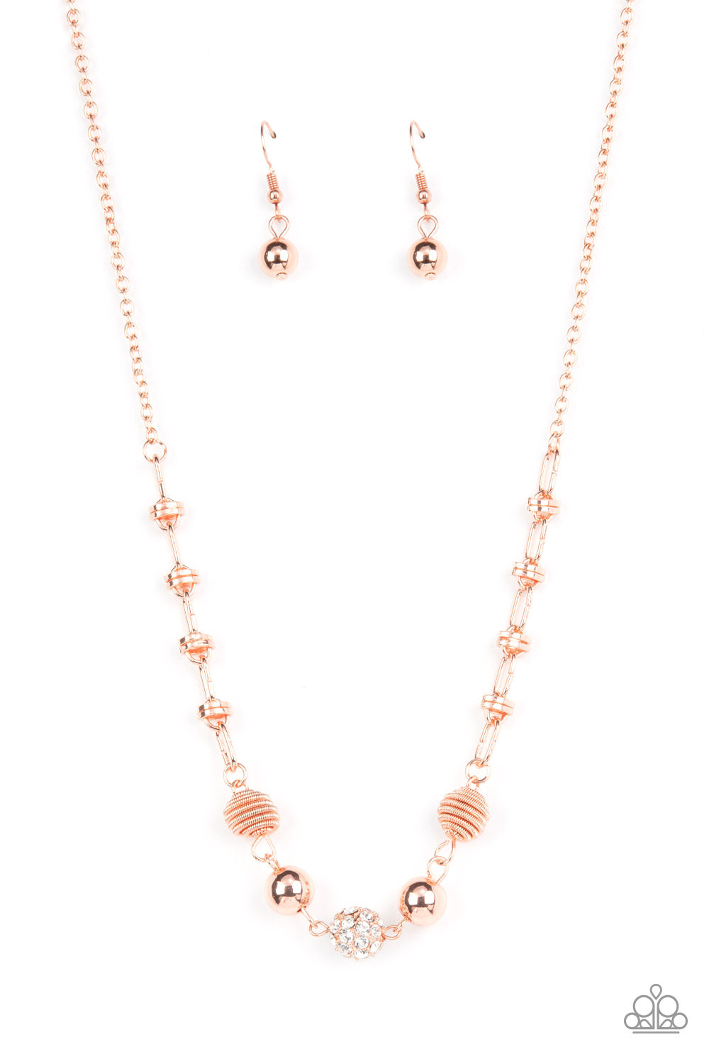 Pairs of shiny copper coiled and shiny copper beads flank a white rhinestone encrusted bead along an oval and shiny copper disc linked chain, creating a glitzy combination below the collar. Features an adjustable clasp closure.